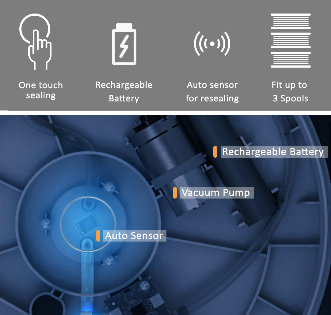 Die SMARTE Vakuum-Filamentaufbewahrungslösung. Mit einer eingebauten Vakuumpumpe und einem wiederaufladbaren Akku kann dieser Filamentbehälter durch Drücken EINER Taste vakuumversiegelt werden. Keine manuellen Pumpen mehr. Noch wichtiger ist, dass wir im Inneren auch einen Wiederversiegelungssensor integriert haben, der das Vakuumniveau ständig überwacht und die Vakuumpumpe automatisch aktiviert, sobald das Vakuumniveau sinkt. Dies verhindert ein Auslaufen über einen längeren Zeitraum. Bewahren Sie Ihr Filament einfach auf, ohne sich Gedanken über Undichtigkeiten machen zu müssen.