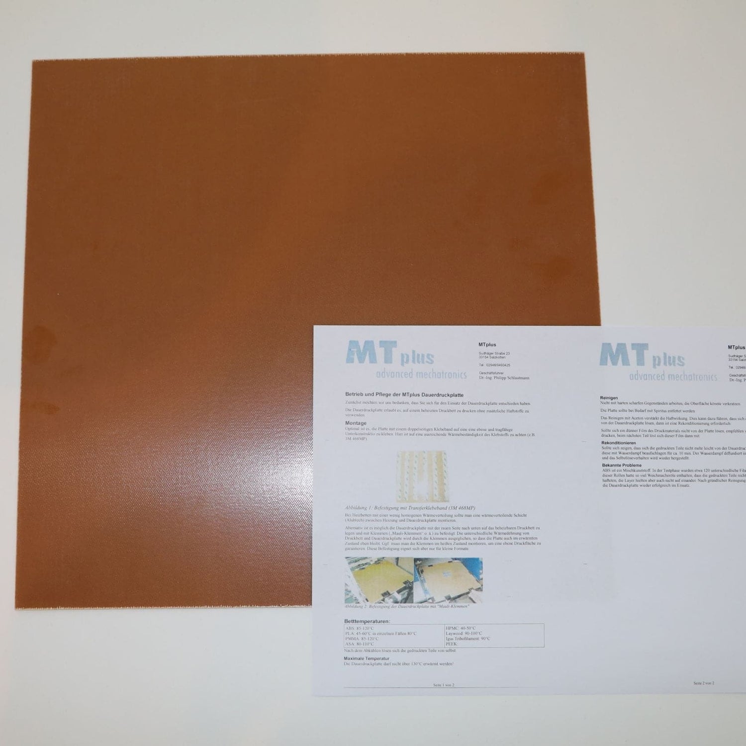 Die ausgezeichneten Materialeigenschaften dieser Dauerdruckplatte erlauben eine optimale Haftung der gedruckten Teile während des Drucks, beim Abkühlen auf Raumtemperatur lösen sich die gedruckten Teile von selbst. Die original MTplus-Dauerdruckplatte für Raise3D Pro3 Serie unterliegt keinem Verschleiß und ist dauerhaft einsetzbar. Das lästige Bekleben der Druckfläche mit Klebeband entfällt ebenso wie das Einreiben mit obskuren Haftvermittlern.