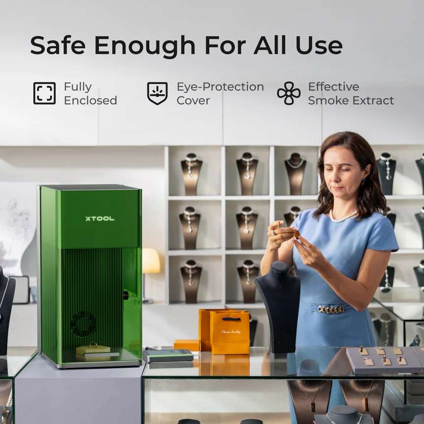 Die vollständig geschlossene Abdeckung schließt das starke Laserlicht und den unangenehmen Rauch ein. Mit dem eingebauten Ventilator und Luftreiniger, der Rauch und Geruch schnell absaugt, können Sie in einem privaten Raum gravieren oder es in der Öffentlichkeit mit einem ruhigen Gefühl zeigen.