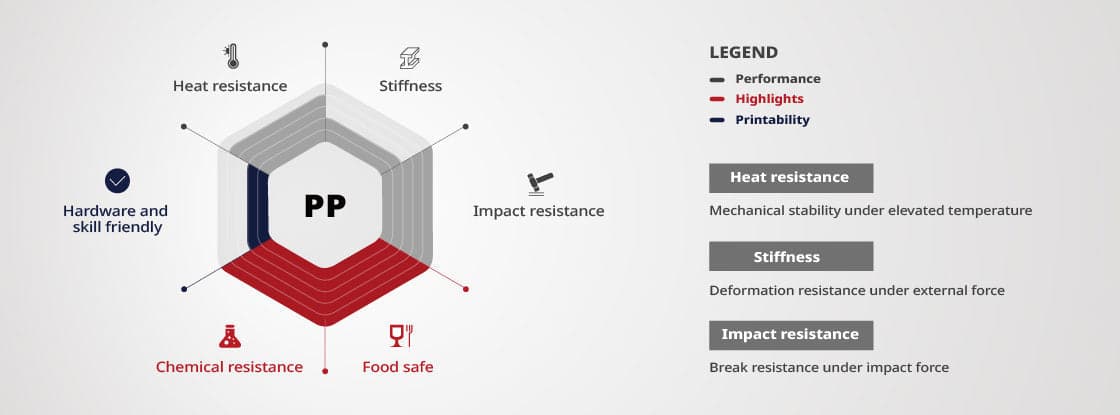 PP (Polypropylen) ist ein thermoplastisches 3D-Druck-Filament und wird auch im täglichen Leben häufig verwendet. PP-Filament ist langlebig, bruchfest, ermüdungsbeständig und halbflexibel. Teile, die aus PP gedruckt werden, eignen sich gut für Anwendungen, bei denen sie verdreht, gebogen oder geknickt werden. PP ist auch ein kontaktsicheres Material für Lebensmittel, Chemikalien und medizinische Anwendungen, einschließlich orthopädischer Anwendungen, aufgrund seines geringen Gewichts und seiner geringen Reibung.