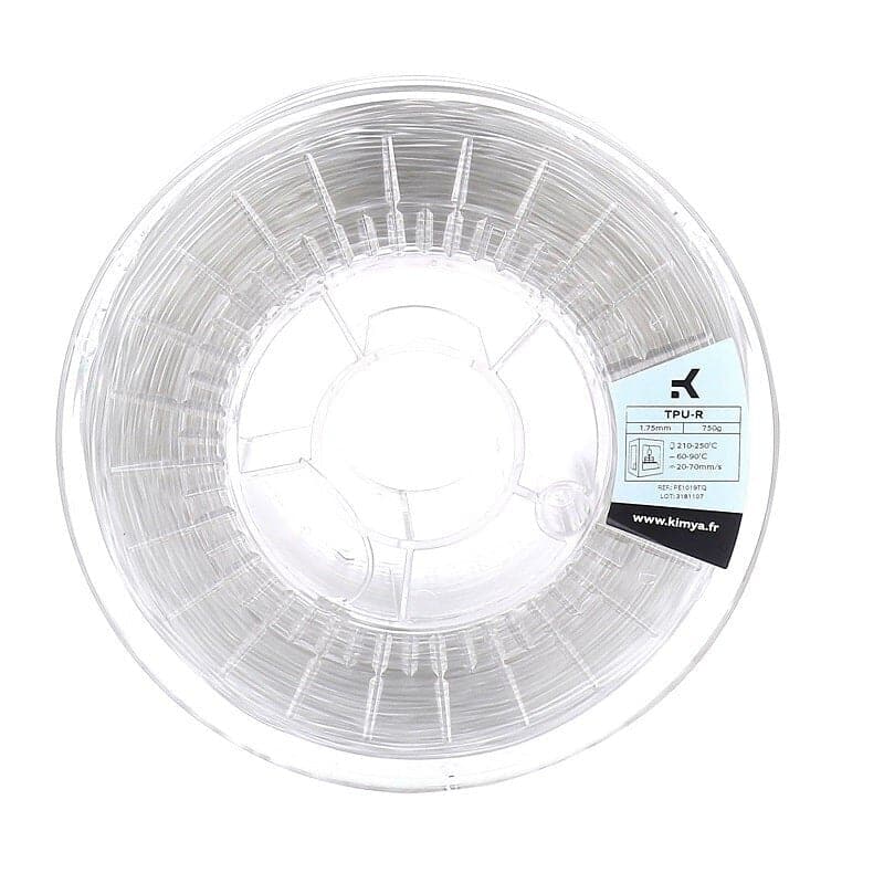 Das Kimya TPU-R 3D-Filament gehört zur Familie der Polyurethane. Thermoplastisches Polyurethan (TPU) ist ein Elastomer, das aus recycelten Materialien hergestellt wird. Es kombiniert elastische und mechanische Eigenschaften. Diese Kombination verleiht dem Filament Eigenschaften wie Elastizität, Transparenz und Beständigkeit gegen Öl, Fett und Abrieb. Das TPU-R 3D-Druckmaterial hat eine Shore-Härte von 92 A. Es ermöglicht den Druck von starken und flexiblen Teilen. Es wird in der Elektronik-, Automobil-, Konsumgüter- und Sportartikelindustrie verwendet.