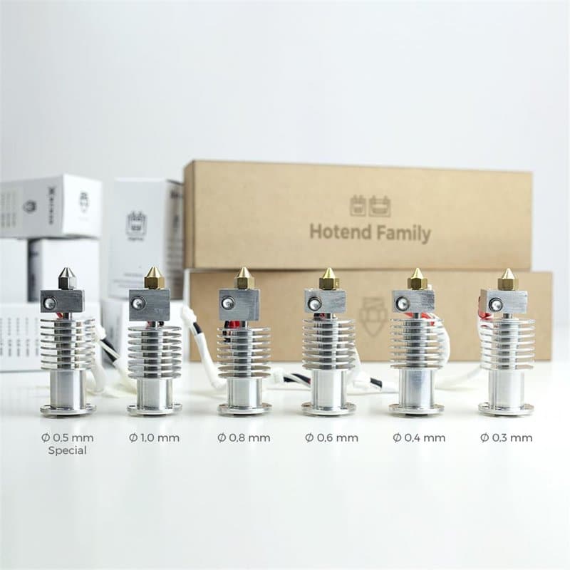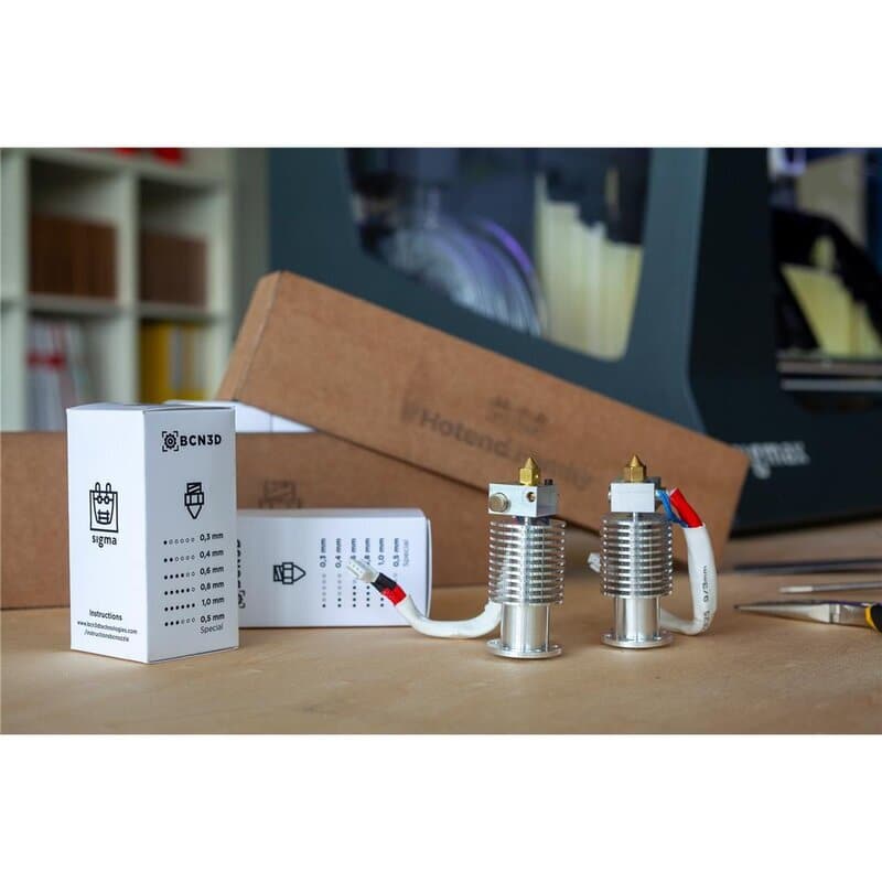 Les hotends sont livrés en standard à partir de la BCN3D R19, mais sont également rétrocompatibles avec les anciennes versions de l'imprimante. Les buses de pression (buses) sont disponibles en différents diamètres. Les buses en laiton standard sont disponibles en diamètres de 0,3 mm, 0,4 mm, 0,6 mm, 0,8 mm et 1,0 mm. Les buses plus fines conviennent aux modèles détaillés plus petits et les diamètres de buse d'impression plus grands pour un processus d'impression plus rapide.