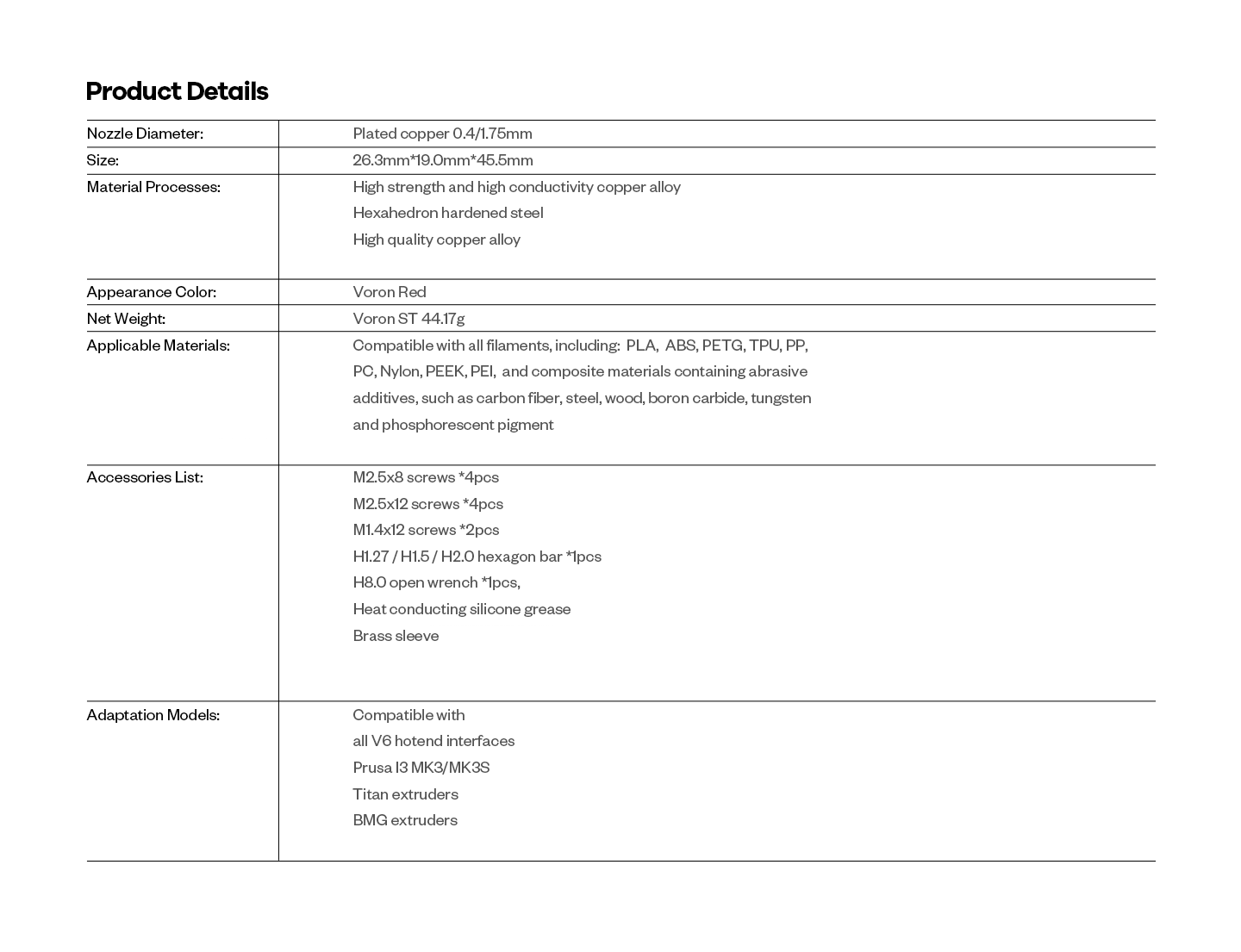 PLA, ABS, PETG, TPU, PP, PC, Nylon, PEEK, PEI et matériaux composites avec des additifs abrasifs tels que la fibre de carbone, l'acier, le bois, le carbure de bore, le tungstène et les pigments phosphorescents.