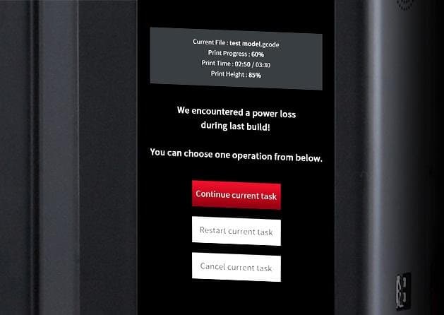 Ce que même nous ne savions pas encore, c'est ceci Fonction REPRISE . Cela permet aux travaux d'impression actifs de continuer même après une panne de courant. Une batterie intégrée de 1000 mA permet de sauvegarder la progression de l'impression et de reprendre facilement le processus d'impression.