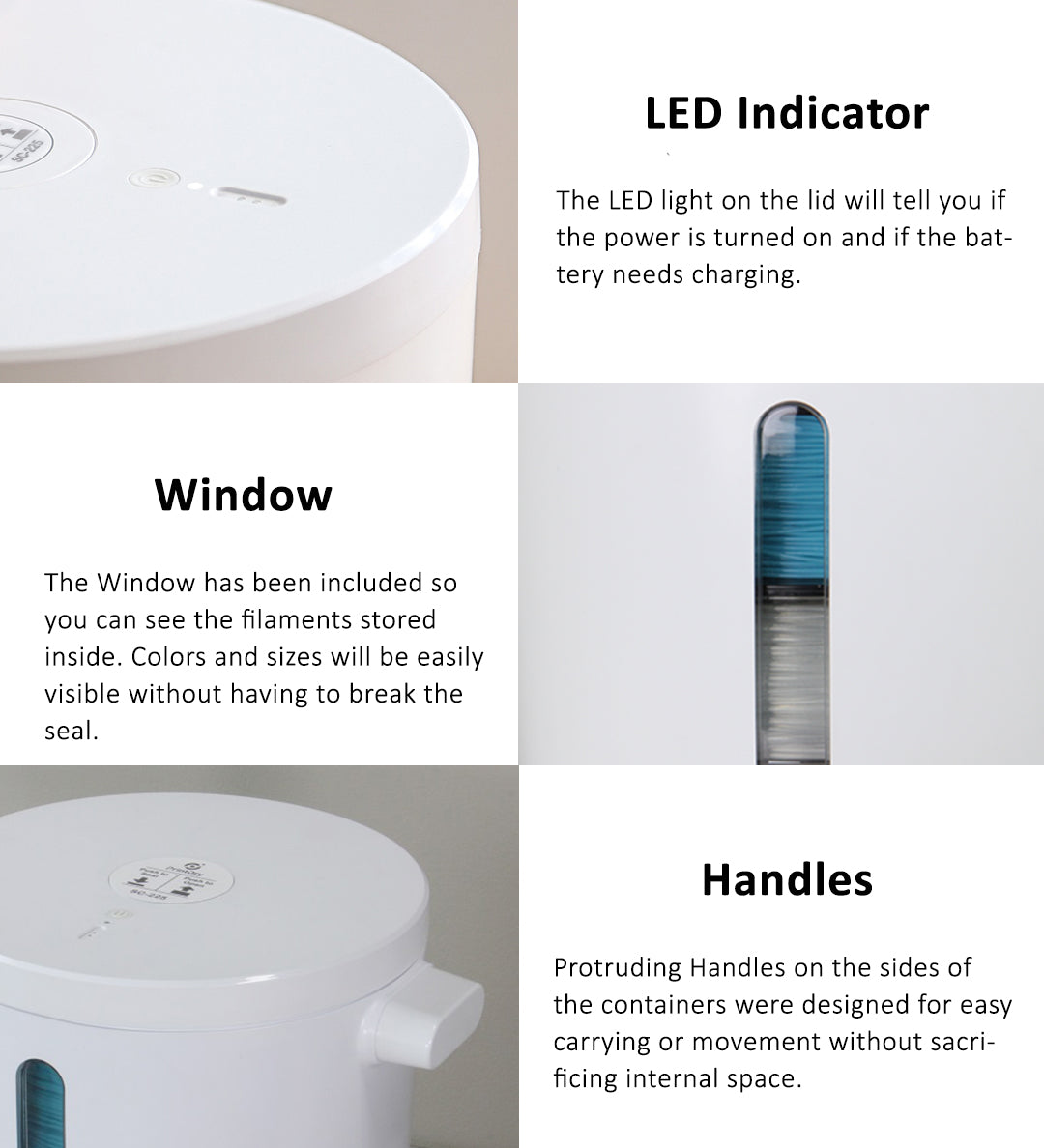 Die SMARTE Vakuum-Filamentaufbewahrungslösung. Mit einer eingebauten Vakuumpumpe und einem wiederaufladbaren Akku kann dieser Filamentbehälter durch Drücken EINER Taste vakuumversiegelt werden. Keine manuellen Pumpen mehr. Noch wichtiger ist, dass wir im Inneren auch einen Wiederversiegelungssensor integriert haben, der das Vakuumniveau ständig überwacht und die Vakuumpumpe automatisch aktiviert, sobald das Vakuumniveau sinkt. Dies verhindert ein Auslaufen über einen längeren Zeitraum. Bewahren Sie Ihr Filament einfach auf, ohne sich Gedanken über Undichtigkeiten machen zu müssen.